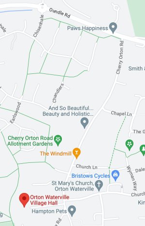 Turn into Cherry Orton Road, follow through village, then turn right just after Church Drive. The hall is at the end of the road.